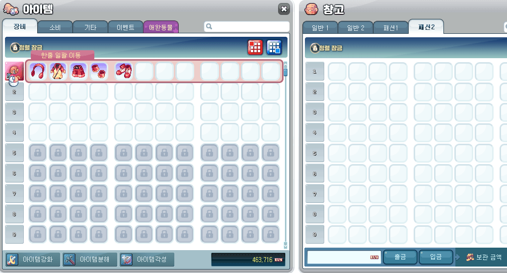 ▷ 仓库和库存均打开的情况下,可以按行存储和接收物品。