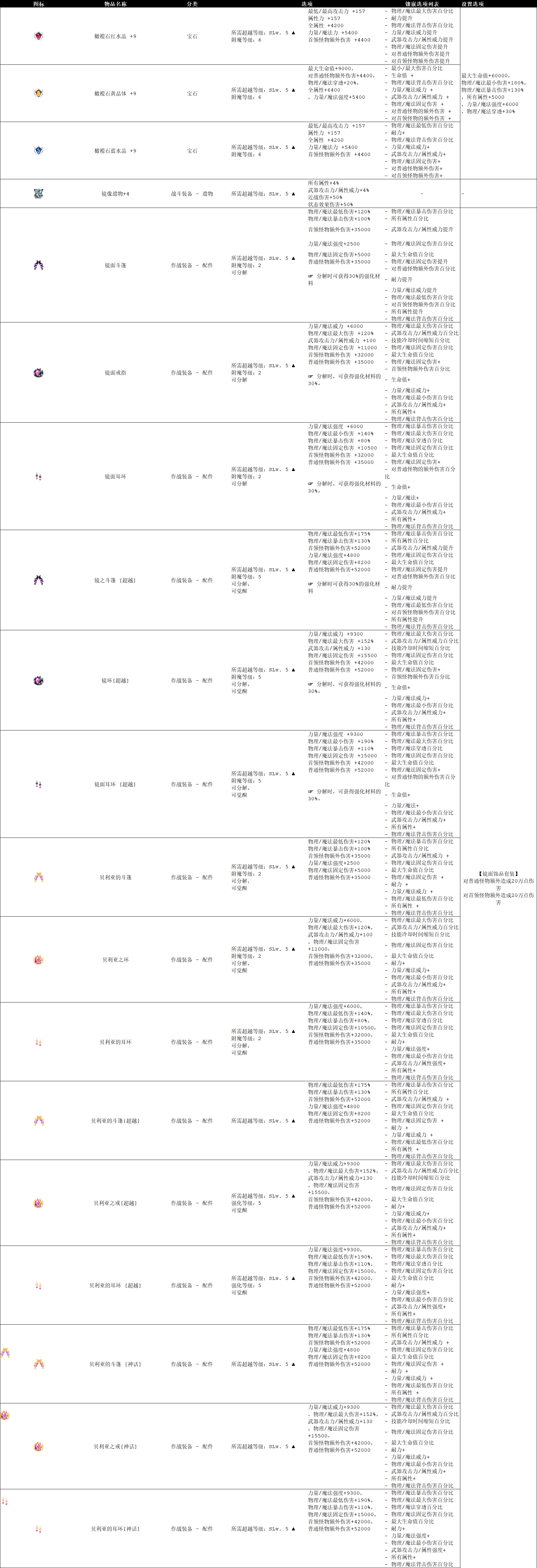 | 掉落时最多可获得5等级的镶嵌等级 | 可附魔属性共13种 | 赋予3~10次的封印次数 | 若未掉落贝利尔饰品【神话】,则必定掉落1个贝利尔饰品 |