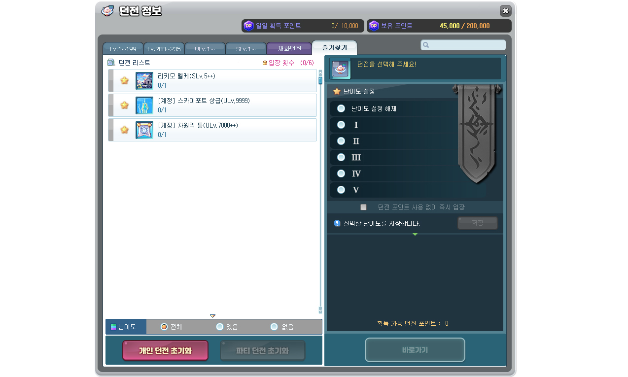 ▷ 在地下城信息界面中选择每个地下城难度时,可以查看地下城信息和奖励地下城点数的数值。
