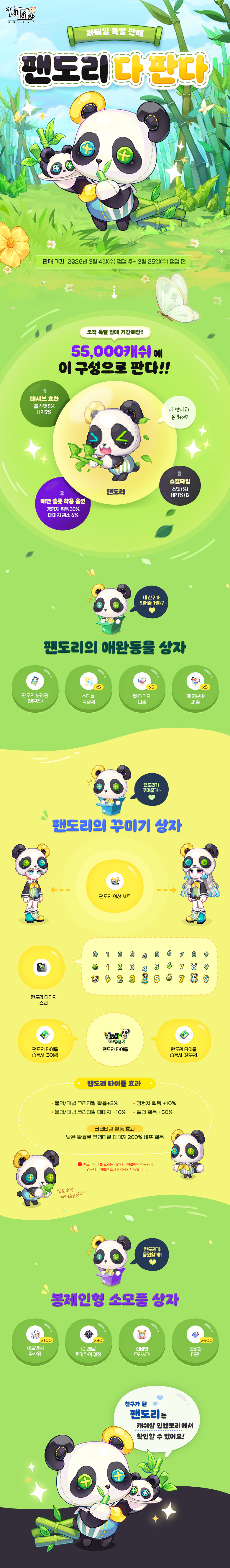 小铁匠 2026年3月4日 字数:151,阅读约1分钟 全屏显示 [3.4-3.25]宠物礼包-潘达利 宠物礼包 1.2K+ 8 0 宠物属性 贩卖时间 ⏰ 03.04-03.25 正在进行 ⏰ 11.05-11.26 已经结束 ⏰ 05.07-05.28 已经结束 页面展示 历史留存 已结束 ❤️ 历史活动记录,可输入密码123后加载 隐藏内容,输入密码后查看 提交验证 活动 宠物礼包 本文作者:小铁匠本文链接: https://latale.com.cn/pet-start/72.html 版权声明:本小站内容均可转载发布,最好帮忙宣传一下,感谢了您~ 80[3.4-3.25]宠物礼包-潘达利海报分享QQ分享QQ空间微博分享复制链接 支付宝扫一扫 微信扫一扫 感谢支持 文章很赞!支持一下吧